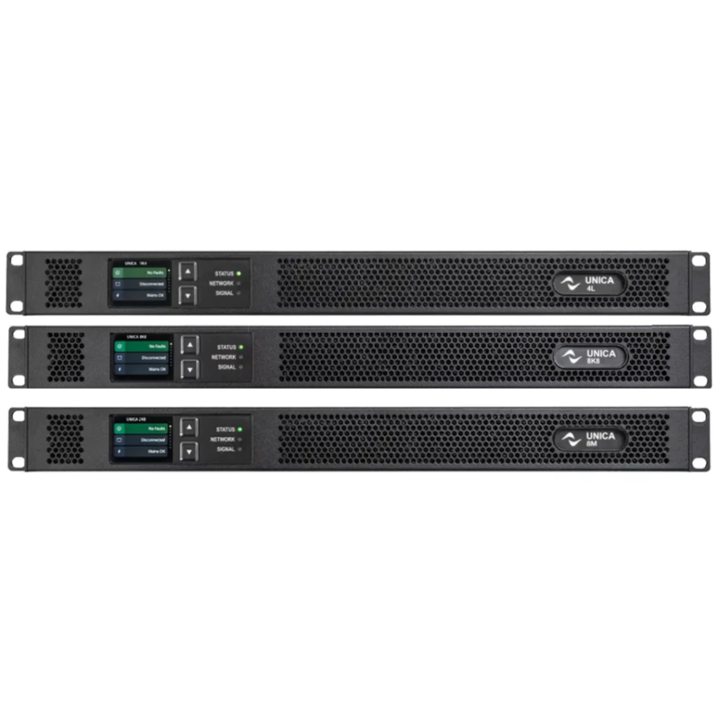 A série Unica™ é uma plataforma amplificadora compacta de 1U, desenvolvida principalmente para aplicações instaladas. A versão de 4 canais inclui modelos de potência total de 5kW, 9kW, 12kW e 16kW, tornando a Unica™ uma das soluções mais densas em potência disponíveis. Os canais de saída podem acionar linhas Lo-Z e 70/100V de forma contínua, entregando até 5200W @ 4Ω para o modelo de 16kW, quando carregado assimetricamente. A fonte de alimentação permite operação mundial (100-240VAC) e está equipada com a última geração de correção de fator de potência (PFC) de estágio único. O gerenciamento proprietário Smart Rails Management (SRM) permite que os trilhos de alimentação se adaptem em tempo real à voltagem de saída necessária para maximizar a eficiência e reduzir perdas em modo ocioso. A plataforma Unica™ apresenta o DSP de próxima geração da Powersoft para processamento e desempenho de áudio de última geração. As três portas Ethernet de 1 Gb, juntamente com o suporte nativo a Dante™ e AES67, permitem diferentes topologias de rede, incluindo encadeamento em série e redundância Dante™. O display frontal permite acesso rápido às informações de status de operação do amplificador para monitoramento local. A entrada PoE (Power over Ethernet) permite um tempo de recuperação curto em caso de perda de energia elétrica, bem como teste e monitoramento de alto-falantes 24/7 sem a necessidade de energia elétrica. Por fim, os amplificadores da série Unica™ suportam nativamente conectividade em nuvem para monitoramento e controle remoto de qualquer dispositivo em qualquer lugar do mundo via Powersoft Cloud.